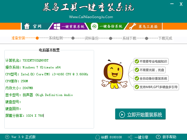 菜鳥一鍵重裝系統圖文教程菜鳥工具是一款可以一鍵重裝系統的裝機軟件,適合大部分電腦小白使用。不過第一次使用菜鳥工具可能會不太清楚操作方法。那么下面就讓小編給大家帶來菜鳥工具如何一鍵重裝系統。
