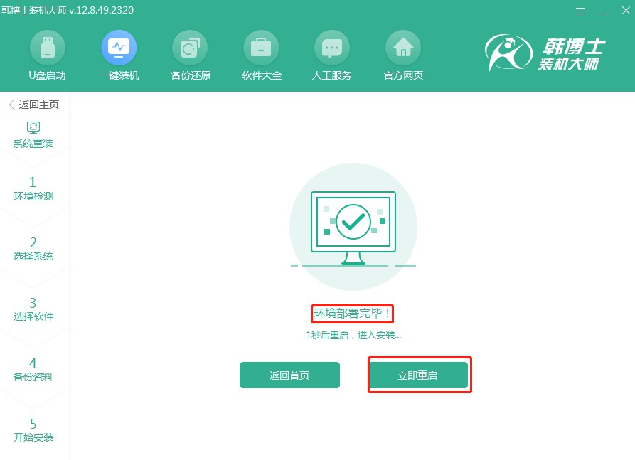 1.請先確保“韓博士裝機大師”軟件已經下載到你的電腦桌面。找到它并雙擊打開,然后在軟件的主界面點擊“開始重裝”。