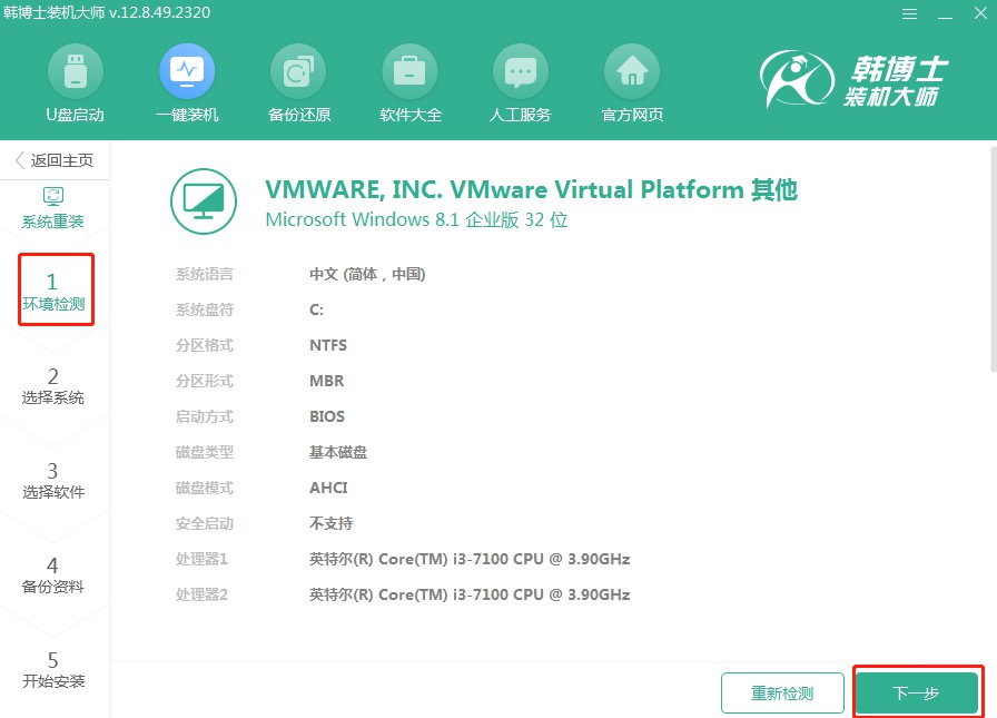 2.“環境監測”正在被系統執行,無需您插手,一旦完成,請選擇“下一步”。