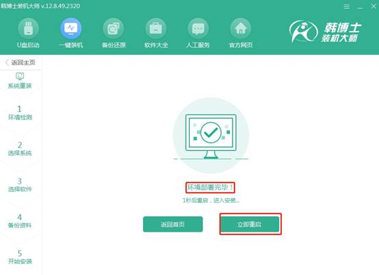 1.打開韓博士官網(wǎng),下載裝機(jī)大師安裝程序,完成安裝后啟動軟件,在界面上選擇“開始重裝”,然后按照提示操作。