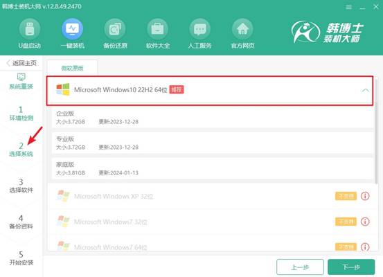 3.進(jìn)入“選擇系統(tǒng)”界面后,您可以看到不同版本的win10系統(tǒng),選擇最適合您的版本,點(diǎn)擊“下一步”開始安裝。