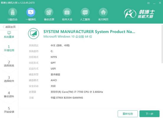 2.環(huán)境檢測完成后,韓博士會提示您繼續(xù)下一步,只需點(diǎn)擊“下一步”繼續(xù)操作。
