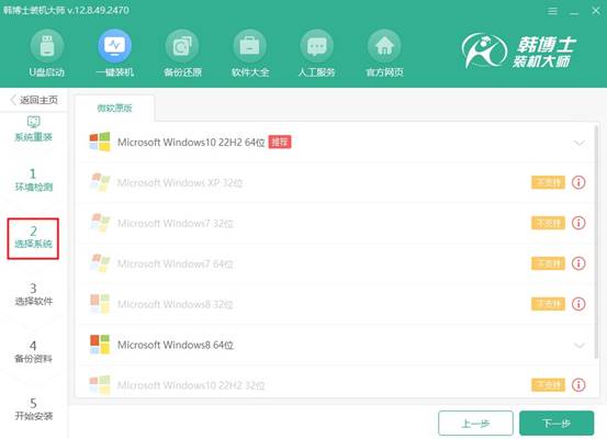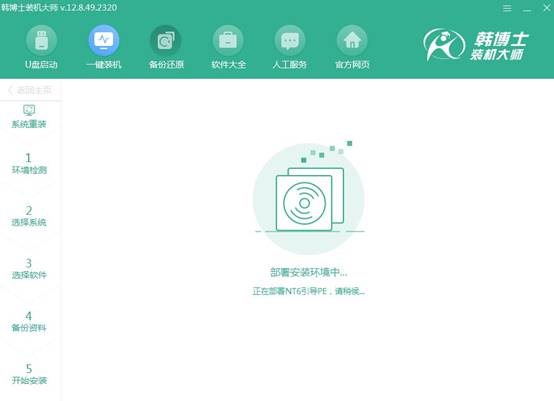 第一步,打開(kāi)韓博士官網(wǎng),下載裝機(jī)大師安裝程序,完成安裝后啟動(dòng)軟件,在界面上選擇“開(kāi)始重裝”,然后按照提示操作。