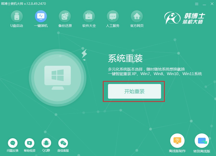 1.進入韓博士官網下載裝機大師,安裝后打開,點擊“開始重裝”按鈕,按照提示一步步完成操作流程。