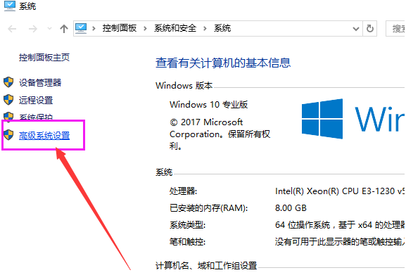 1.右鍵win10桌面此電腦圖標(biāo),打開(kāi)屬性界面。在打開(kāi)的界面中選擇高級(jí)系統(tǒng)設(shè)置進(jìn)入。
