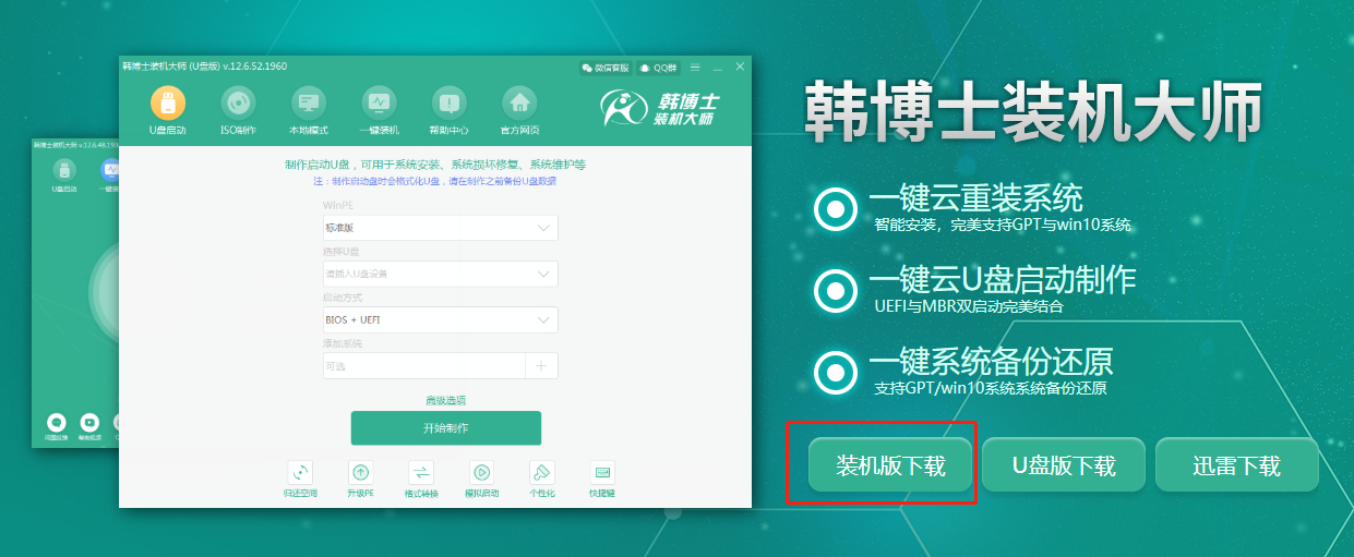 1.提前在官網下載韓博士裝機大師軟件,下載后退出殺毒應用雙擊打開韓博士。