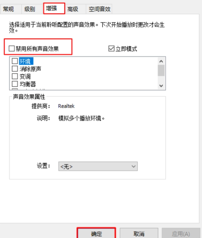 4.把上方切換至“增強”菜單欄,取消勾選“禁用所有聲音效果”,再點擊“確定”按鈕即可。