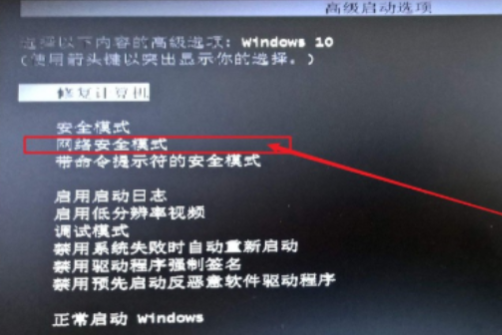 1.強制關機后再重新開機,進入系統(tǒng)后,按F8進入“高級啟動選項”,選擇“網(wǎng)絡安全模式”,并回車進入。