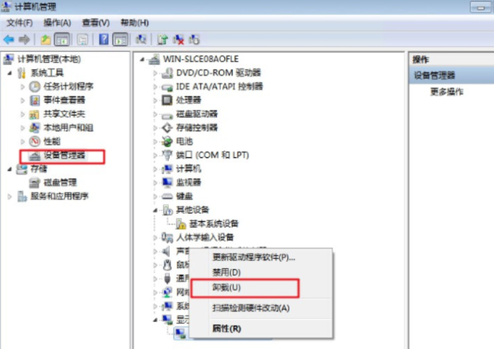2.進入后,右擊“此電腦”,選擇“管理”。進入計算機管理頁面后,再點擊“設備管理器”,展開“顯示適配器”,右擊顯卡驅動并選擇“卸載”。