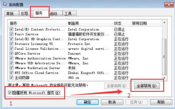 2.進入系統配置頁面,切換至“服務”,勾選“隱藏所有Microsoft服務”,接著點擊“全部禁用”。