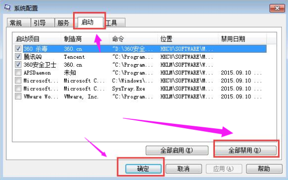3.再切換至“啟動”選項,勾選禁用開機啟動項目,再點擊“全部禁用”,最后點擊“確定”即可。