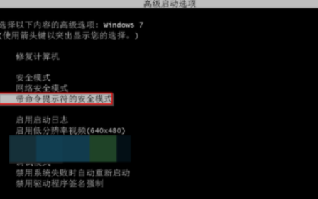 1.在開機時按下F8,點擊“帶命令提示符的安全模式”。