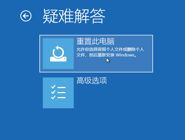 1、強制開關機,等屏幕出現“修復”界面后,點擊“高級修復選項”依次點擊“疑難解答”-“重置此電腦”。