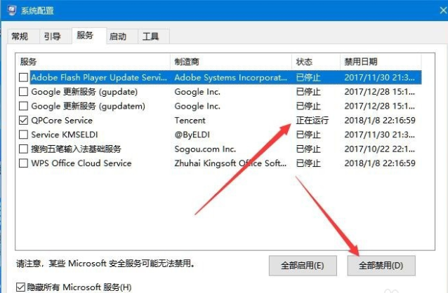 4.找到正在運(yùn)行的服務(wù)項(xiàng),點(diǎn)擊全部禁用,再確定。